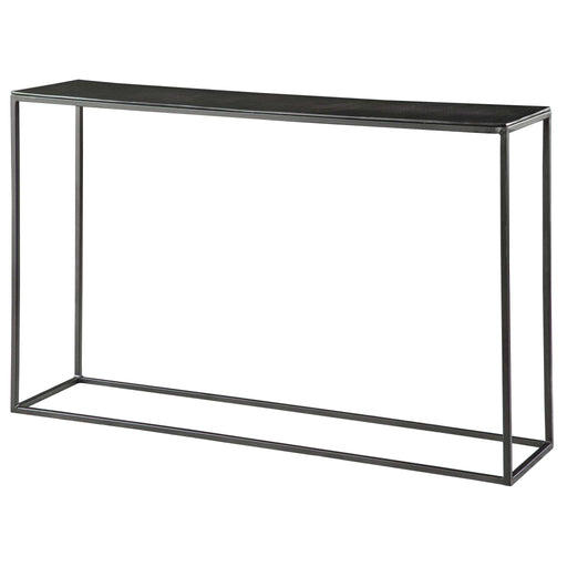 Classic And Minimalistic, This Narrow Console Table In Steel Is Finished With A Streamlined Rustic Black, Inset With A Beveled Mirrored Top, And Ga...