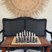 Crafted by African artisans in Western Kenya using traditional techniques, this soapstone chess set will become a conversation piece during play or on display! The board approximately 14 - 15 inches square inlaid with grey and white soapstone. Each piece is hand carved in either grey or white soapstone. The banana fiber box measures approximately 15.5 x 15.5 x 3 inches and makes for great decor and storage!