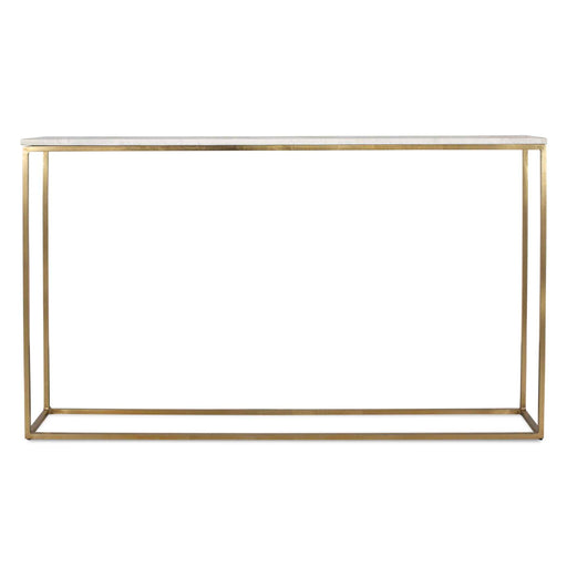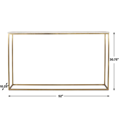 Classic And Minimalistic, This Narrow Console Table Is Supported By Brass Finished Metal Legs And Complemented By A White Marble Top With Subtle Gr...