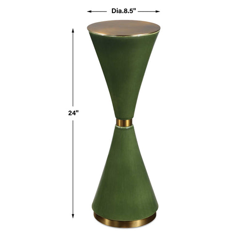 This Striking Ceramic Drink Table Showcases A Captivating Hourglass Silhouette In A Rich Jade Green Glaze, Accented By Brass Plated Iron Details.Pr...
