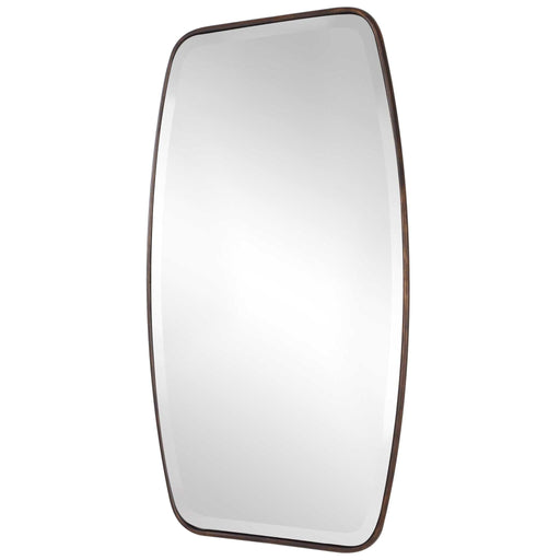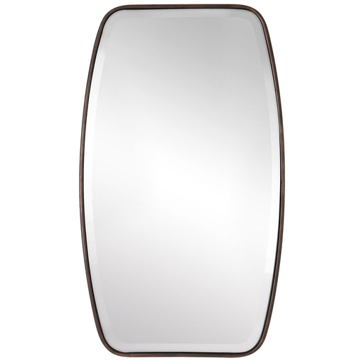 This Shaped Mirror Frame Is Forged From Rounded Metal Finished In A Lightly Distressed Dark Bronze, Featuring A Floating Beveled Mirror. May Be Hun...