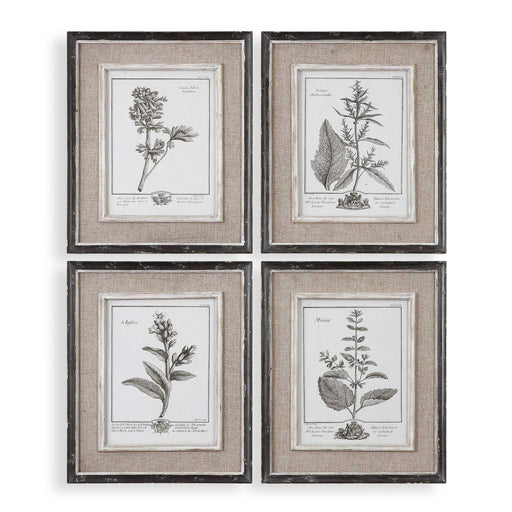 These Botanical Prints Feature A Contemporary Take On An Antique Style. Each Black And White Print Is Surrounded By A Light Tan Burlap Mat. The Out...