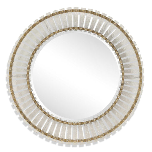 The Denali Round Mirror Features Textured Glass Keys Suspended Around Brushed Gold Iron Frames. Mirror Has A Generous 1" Bevel.Product FeaturesDesi...