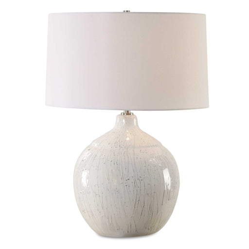 This Ceramic Table Lamp Features A White Glaze Finish With A Dripped Gray Texture, Paired With Plated Brushed Nickel Accents. The Slightly Tapered ...
