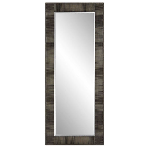 This Oversized Mirror Features A Solid Wood Frame With Hand Carved Channels Finished In A Rustic Wood Tone With An Aged Gray Wash. Mirror Has A Gen...