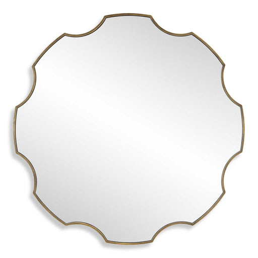 Our Gear-shaped Mirror Boast An Iron Frame With A Channeled Side And A Richly Antiqued Golden Bronze Finish. Its Distinctive Silhouette Encases A F...