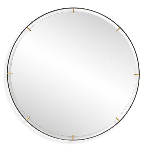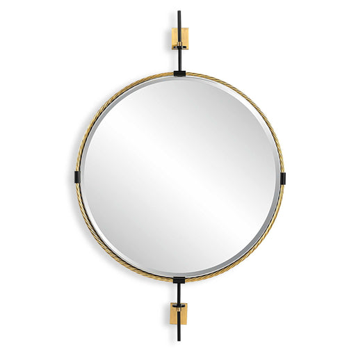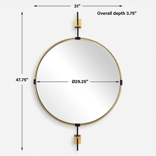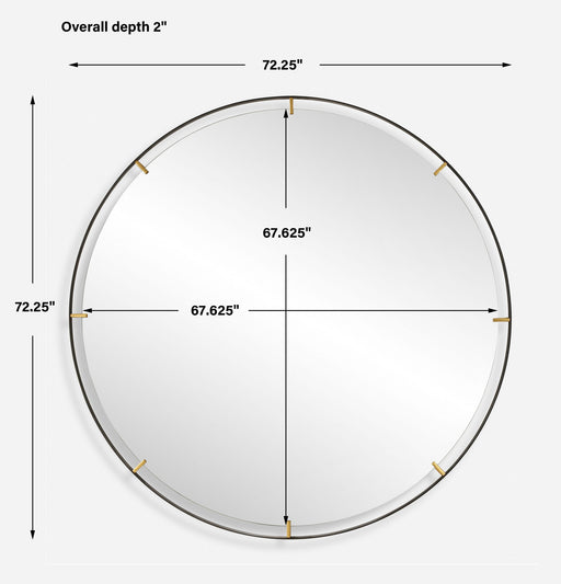 Elevate Your Home Decor With Our Grand Pendulum Round Mirror. Crafted With A Hefty Black Iron Frame Accented By Lightly Antiqued Gold Clips That He...