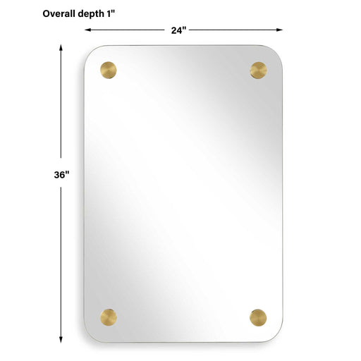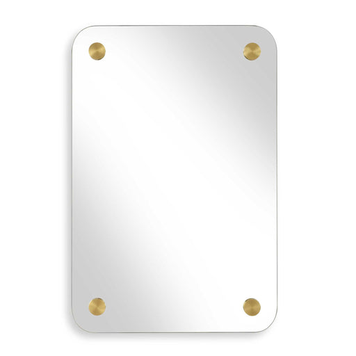The Hamrick Mirror Showcases A Frameless, Polished Edged, Rectangular Mirror With Softly Rounded Corners, Adorned With Four Decorative Brass Plated...