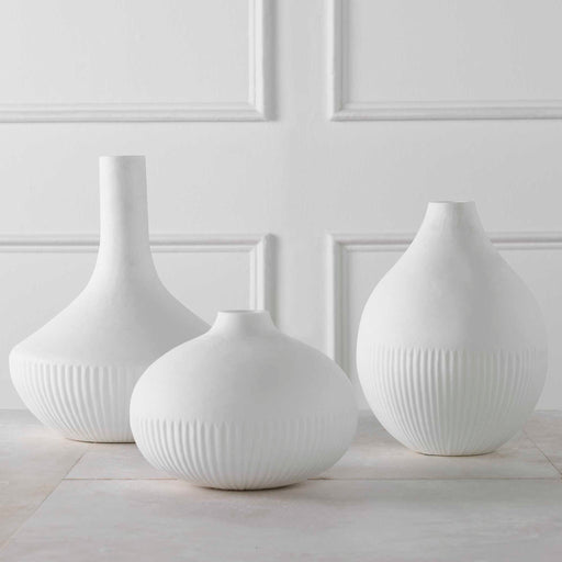 The Apothecary Vases Showcase Three Varying Curved Silhouettes Accented By Carved Details In A Satin White Finish. Sizes: S-8x6x8, M-8x11x8, L-10x1...