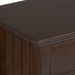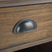 • Rustic design includes tapered legs, grooved sides, molded crown edged table top and vintage style bronze drawer pulls