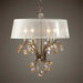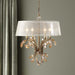 Burnished Gold Metal With Golden Teak Crystal Leaves And A Silken Champagne Sheer Fabric Shade. 4-60 Watt Max, Candelabra Sockets.Bulbs Not Included. Supplied With 12' Wire And 5' Chain For Adjustable Installation.