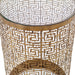 Greek Key Inspired Elements Elevate This Slender Drum Table Design In Lightly Antiqued Gold Finished Iron, Topped With Clear Glass.