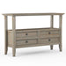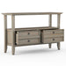 - Transitional Design includes tapered legs, molded crown edged table top, panel framed drawer fronts, metal drawer glides and Antique Pewter round decorative knobs