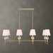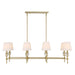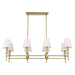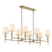 A Regal 8 Lt. Linear Chandelier In A Warm Natural Brass Finish With Clear Cut Crystal Accents Topped With Tapered White Silken Shades. 8-60 Watt Max Candelabra Sockets. Bulbs Not Included. Supplied With 20' Wire, 6-12" Stems And 2-6" Stem For Adjustable Installation.