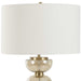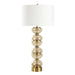 A Modern Statement Piece Featuring Stacked, Light Amber Glass Half-spheres And Luxurious Brass Plated Iron Accents. The Round Hardback Drum Shade Is Covered In A Casual White Linen Fabric.