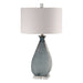Deep Ocean Blue Glass With An Acid Etched Texture, Accented With Brushed Nickel Plated Details And A Thick Crystal Foot. The Round Hardback Drum Shade Is A White Linen Fabric.
