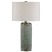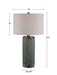 Ceramic Table Lamp Finished In A Crackled Aqua Blue Glaze With Dark Rustic Bronze Distressing, Accented With Light Antique Brushed Brass Details. The Round Hardback Drum Shade Is A Light Beige Linen Fabric.