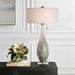 Gloss White Glass Featuring Metallic Smoked Bronze Hues Accented With Plated Brushed Brass Metal Details And A Thick Crystal Foot. The Round Hardback Drum Shade Is A White Linen Fabric With Natural Slubbing.