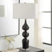 The Caviar Table Lamp Features A Ceramic Base That Boast A Curvaceous Silhouette Finished In A Matte Black Glaze And Displayed On A Crystal Foot And Accented With Antique Brass Hardware. A White Linen Round Hardback Shade Completes The Piece.