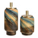 These Stunning Glass Canisters Showcase A Beautiful Blend Of Blues, Caramels, And Bronze Metallics, Creating A Striking Visual Appeal For Any Decor. Each Canister Features A Lift-off Brass Finished Lid That Adds A Touch Of Elegance And Sophistication. Perfect For Storing Kitchen Essentials, Snacks, Or Decorative Items, These Canisters Not Only Provide Functionality But Also Serve As Eye-catching Accents On Countertops, Shelves, Or Dining Tables. Elevate Your Space With These Stylish And Versatile Storage Solutions. Sizes: S- 7x11x7, L-7x14x7