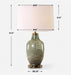 This Glass Table Lamp Features A Beautiful Blend Of Translucent Olive Green With A Subtle Ivory Wash Paired With Metallic Bronze Flecks, Accented With Plated Antique Brass Finished Details. The Slightly Tapered Round Shade Is Covered In A Crisp White Linen Fabric.