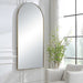 This Oversized Arch Features A Sleek Stainless Steel Frame Finished In A Rich Antique Brass Surrounding A Floating, Polished Edged Mirror.
