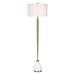 The Curran Floor Lamp Features A Delicately Tapered Metal Body Finished In A Plated Brass And Paired With A Thick White Marble Foot. The Round Hardback Drum Shade Is Covered In A Crisp White Linen Fabric.