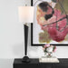 This Futuristic Buffet Lamp Design Is Made Of Cast Black Man-made Stone With A Noticeable Pitted Surface, Paired With Antique Brass Plated Details. The White Linen Fabric Shade Is Reversed Tapered To Follow The Contour Of The Lamp Base For A Unique Display.