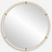 The Cyprus Round Mirror Showcases A White Faux Shagreen Leather Wrap Featuring Brass Plated Steel Bands That Help Elevate This Sophisticated Design.