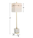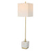 This Versatile Buffet Lamp Showcases A Slim Plated Brushed Brass Metal Base Accented By A Large White Marble Block Foot With Natural Veining. The Square Hardback Shade Is Covered In A Slubbed White Linen Fabric.