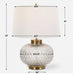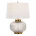 The Estelle Table Lamp Features A Heavily Embossed, Round Lattice Inspired, Light Smoke-gray Glass Base Accented By A Chunky Antique Brass Foot And Hardware. The Slightly Tapered Round Hardback Shade Is Covered In A Crisp White Linen Fabric.
