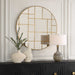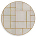 This Round Mirror Is Adorned With A Geometric Grid Pattern Encasing Individual Antique Mirror Inlays, Finished In A Lightly Antiqued Gold Leaf That Exudes Timeless Elegance And Contemporary Flair.