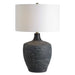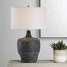 The Graphite Table Lamp Features A Large Ceramic Base In A Distressed Charcoal Finish With Intricate Ribbed Detailing And Antique Brass Plated Hardware. The Round Hardback Drum Shade Is Made In A Casual White Linen Fabric.