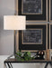 Tapered Cast Iron With A Subtle Textured Surface, With A Raw Steel Finish And Burnished Distressing. The Round Hardback Drum Shade Is A Light Beige Linen Fabric With Natural Slubbing.
