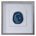 A Pine Wood Shadow Box Featuring A Hand Applied Silver Leaf Finish Showcases A Striking Blue Agate Stone With Light Blue Veining, Accented With Hand Painted Silver Edging. Mounted On A White Linen Backing.