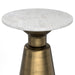 • Hand-finished Metal base in an Antique Brass finish with a White Marble round tabletop.