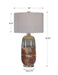 This Table Lamp Features A Ceramic Base Finished In An Earthy Terracotta Rust That Transitions Into A Crackled Green-gray Glaze, Accented With Brushed Nickel Plated Details And A Thick Crystal Foot. The Hardback Drum Shade Is A Warm Gray Linen Fabric With Natural Slubbing.