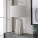 This Ceramic Table Lamp Features A Fluted Design With A Porous Texture Finished In A Stone-ivory And Taupe Glaze, Accented With Brushed Nickel Plated Details And A Thick Crystal Collar. A Light Gray Fabric Drum Shade Completes The Look.