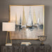This Contemporary, Coastal Design Is Hand Painted On Canvas In Sophisticated Shades With Light Texture Detailing. Navy Blue, Charcoal, And Gray Tones Are Accented By Metallic Silver And Gold Leaf Boat Sails. A Petite, Gold Leaf Frame Completes The Piece. Due To The Handcrafted Nature Of This Artwork, Each Piece May Have Subtle Differences.