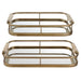 Set Of Two Metal Trays Are Finished In Brushed Gold With Natural Rope Wrapped Handles And Mirrored Bottoms. Sizes: S-17x3x10, L-20x3x11