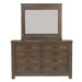 Enhance your home with the Thornwood Hills bookcase bed, dresser, and mirror. Crafted of rubberwood solids with mango veneers, this kit features a rock beaten grey finish with saw cuts, straight line cases with wide pilasters and block feet, metal strip accents, planked tops and side panels, wood framed drawer fronts, full extension drawers with felt lined top drawers, and is accented with dark antique pewter hammered metal bar pull hardware. This unique bookcase bed features a headboard with adjustable shelving for display and storage with wire management access holes in the back panel and a storage footboard complete with two drawers. The dresser features eight drawers of storage, and pairs well with the wood framed mirror that features a beveled edge. Attach the mirror to the dresser with the included bolt-on supports. Add this unique bedroom set to your traditional style home.