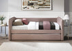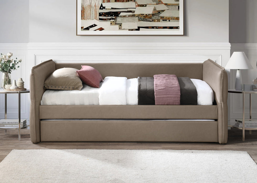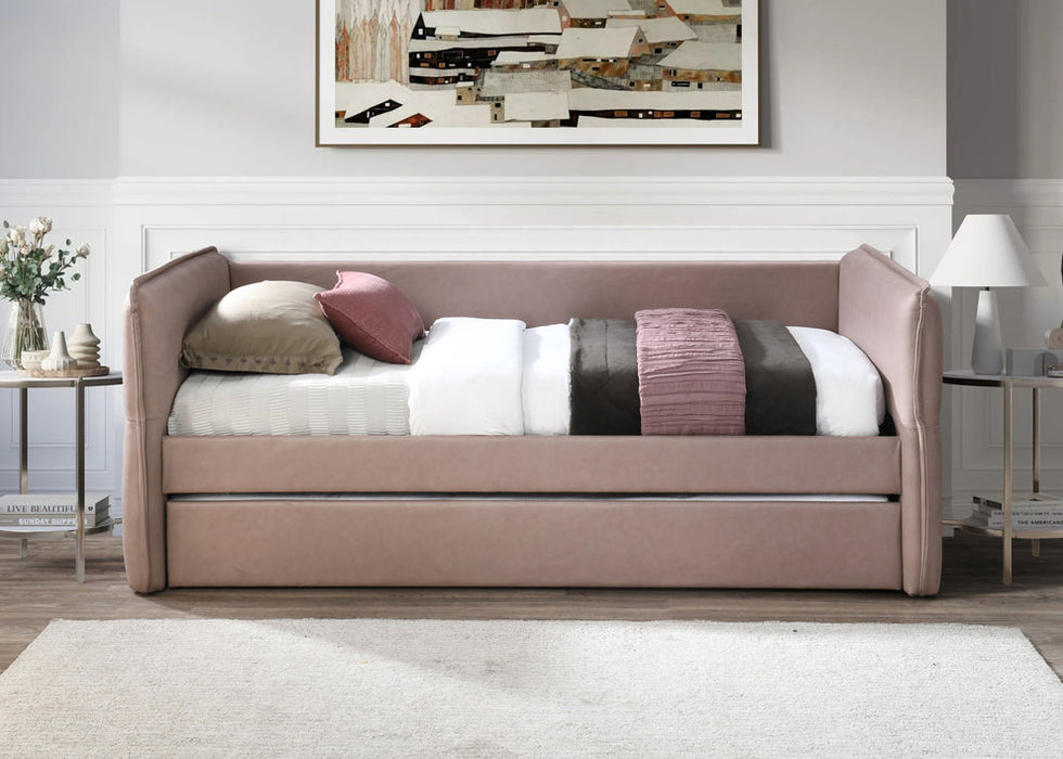The Trina Upholstered Trundle Bed is a perfect addition to any bedroom. Its dusty rose upholstery adds a touch of elegance to any space, while its twin size design ensures it fits into virtually any room. The trundle fits underneath, allowing extra sleeping space when needed.