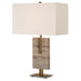 This Striking Lamp Features A U-shaped Unfilled Honed Travertine Design, Artfully Displayed On An Slender Base Finished In An Elegant Plated Brushed Antique Brass. The Rectangle Drum Shade Is Covered In A Crisp White Linen Fabric.