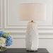 The Vida Table Lamp Base Features A Ceramic Base With A Uniquely Textured Surface And Soft, Flowing Lines. Finished In A Chalk White Glaze And Accented With Plated Brushed Brass Accents And Matching Textured Finial. The Large Round Drum Hardback Shade Is Made In A Casual White Linen Fabric.